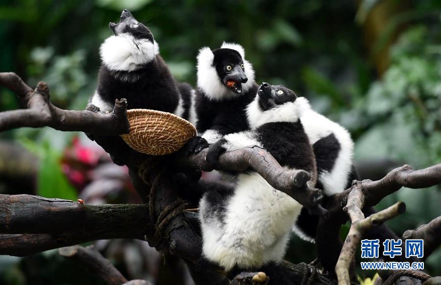 在廣州長隆野生動物世界,斑狐猴三胞胎在樹枝上進食。新華社記者劉大偉攝