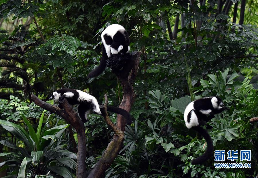 在廣州長隆野生動物世界,斑狐猴三胞胎在樹枝上跳躍。新華社記者劉大偉攝