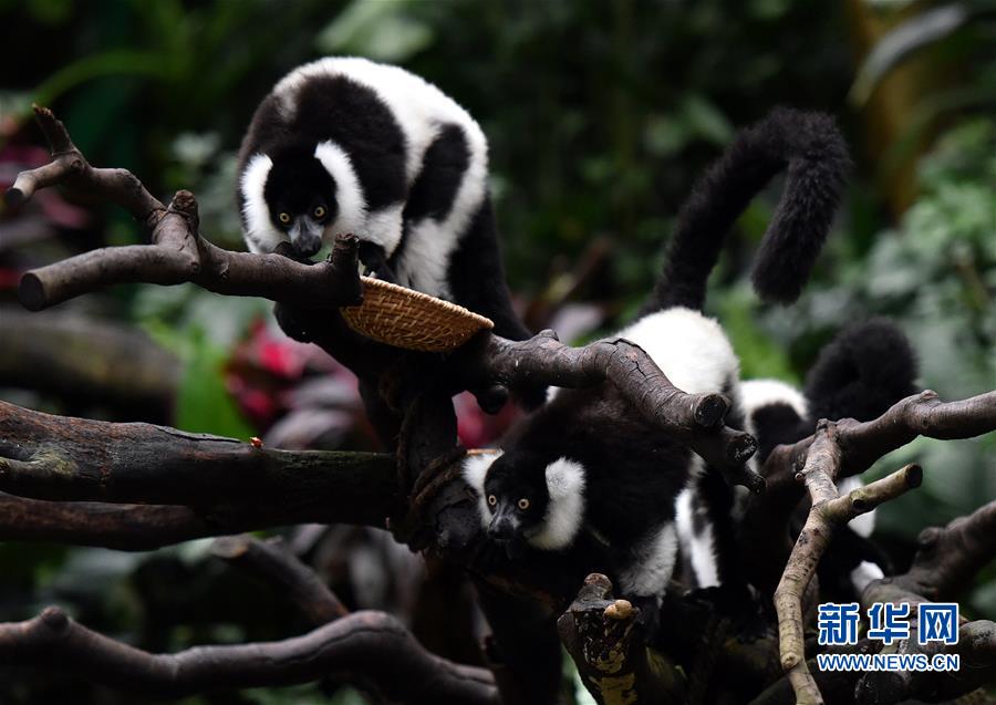 在廣州長隆野生動物世界,飼養(yǎng)員為斑狐猴三胞胎放置食物。新華社記者劉大偉攝