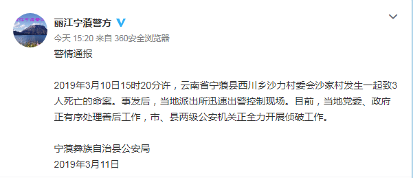 昆明信息港訊 3月11日麗江寧蒗警方官微發(fā)布一則“警情通報”,通報稱,3月10日15時20分許,云南省寧蒗縣西川鄉(xiāng)沙力村委會沙家村發(fā)生一起致3人死亡的命案。目前,公安機關(guān)正全力開展偵破工作。