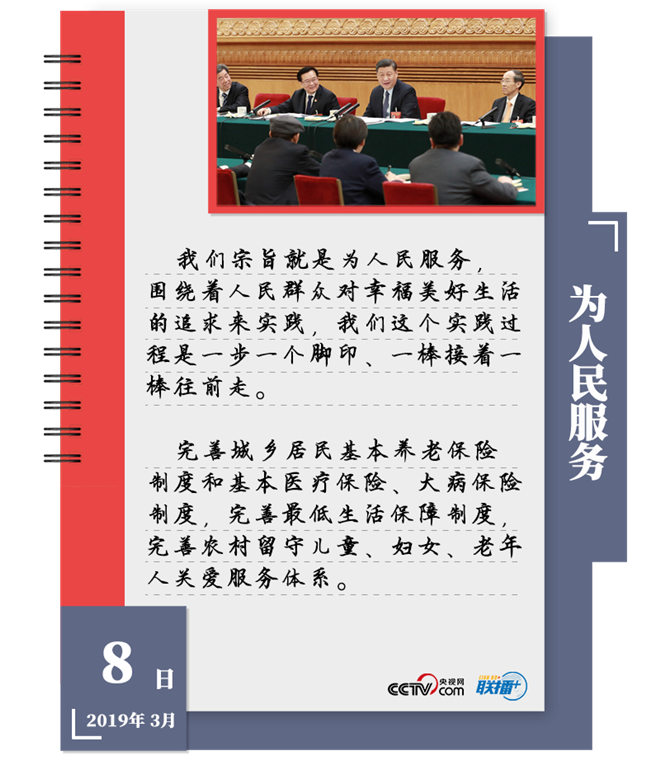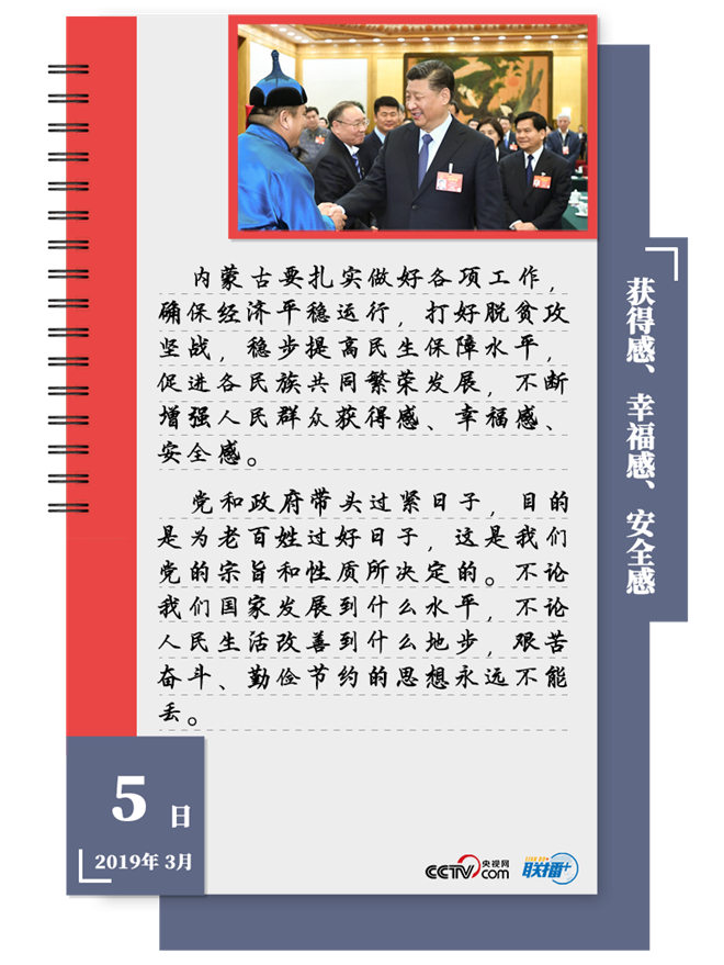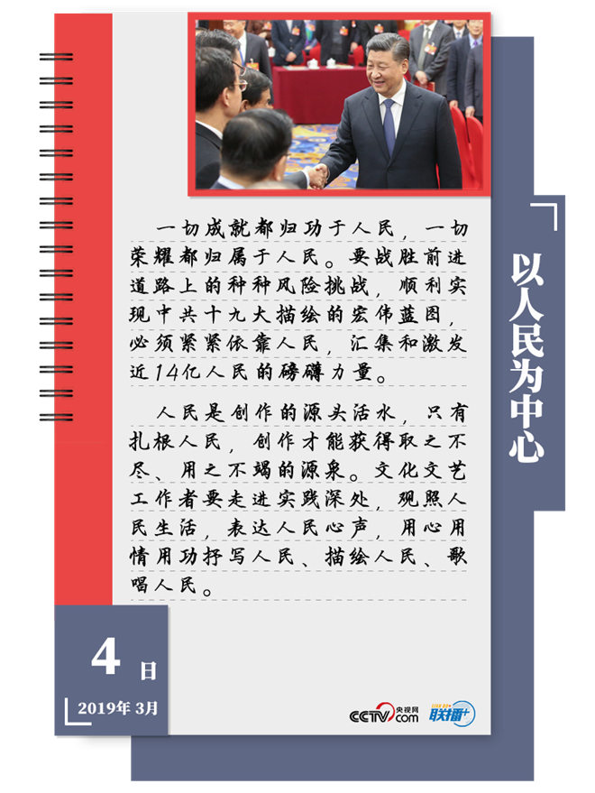 人民在習(xí)近平心中始終居于最高位置。2019年全國兩會,習(xí)近平5次到團(tuán)組,講話中始終緊緊圍繞“人民”二字。他強(qiáng)調(diào)“以人民為中心”,“為人民服務(wù)”,“圍繞著人民群眾對幸福美好生活的追求來實踐”,“一切成就都?xì)w功于人民,一切榮耀都?xì)w屬于人民”。