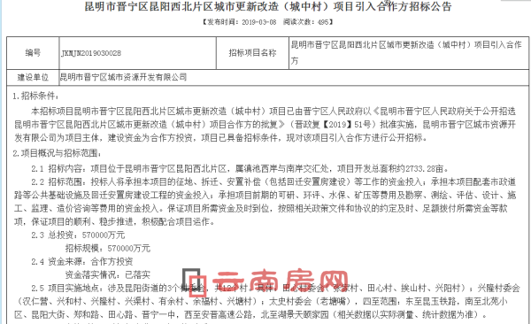 據(jù)公告,項(xiàng)目總投資57億元,計(jì)劃分為三期實(shí)施,每期開發(fā)周期自拆遷公告發(fā)布之日起原則不超過 3 年,當(dāng)前一期開發(fā)建設(shè)達(dá)到總體建設(shè)任務(wù)的80%時,必須啟動下一期開發(fā)任務(wù)。晉寧區(qū)城市資源開發(fā)有限公司為項(xiàng)目主體,建設(shè)資金為合作方投資。