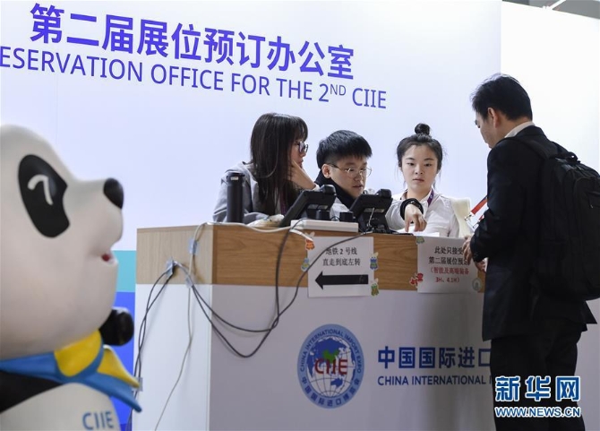 ?在第二屆中國國際進(jìn)口博覽會展位預(yù)訂辦公室,一名來自馬來西亞的客商(右一)申請預(yù)訂展位(2018年11月10日攝)。新華社 記者李賀/攝