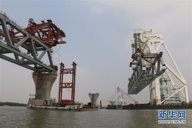 ?2月20日,在孟加拉國帕德瑪大橋項(xiàng)目工地,中國建造的萬噸級中心架梁起重船“天一號”準(zhǔn)備將總重超過3000噸的鋼梁架設(shè)到橋墩上。新華社發(fā) 段永紅/攝