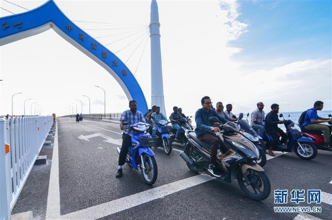 ?在連接馬爾代夫首都馬累和機(jī)場島的中馬友誼大橋上,當(dāng)?shù)鼐用裨跇蝾^等待通行(2018年10月8日攝)。新華社發(fā) 杜才良/攝