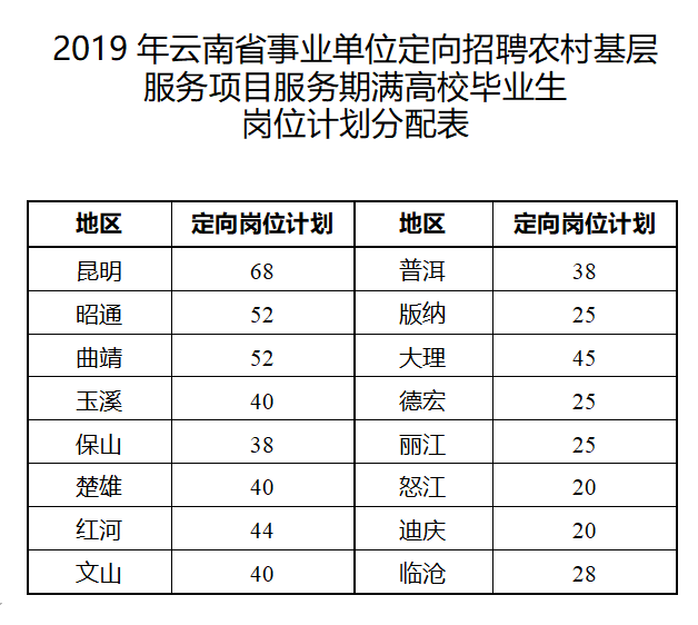 昆明信息港訊 記者勞學麗 3月13日,云南省人力資源和社會保障廳發(fā)布關(guān)于2019年全省事業(yè)單位定向招聘農(nóng)村基層服務(wù)項目服務(wù)期滿高校畢業(yè)生工作公告,計劃在各州市事業(yè)單位設(shè)置600個崗位,定向招聘到農(nóng)村基層服務(wù)項目服務(wù)期滿的高校畢業(yè)。