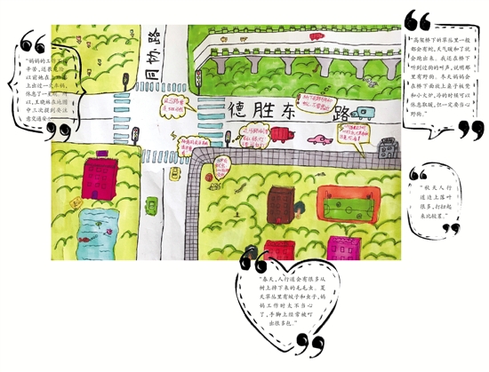 “媽媽的工作不僅辛苦,還很危險(xiǎn)。以前她在上班路上出過(guò)一次車(chē)禍,休息了一星期?!彼?,王曉林在地圖中三次提到要注意交通安全。