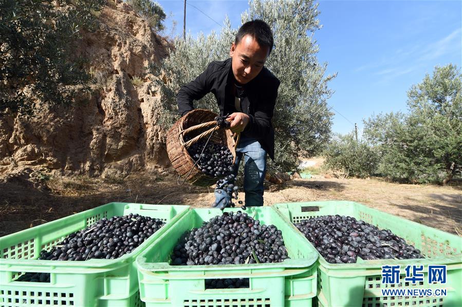 在甘肅省隴南市武都區(qū)漢王鎮(zhèn),一名男子將采摘的油橄欖倒入收納箱(2018年10月30日攝)。新華社 記者范培珅/攝