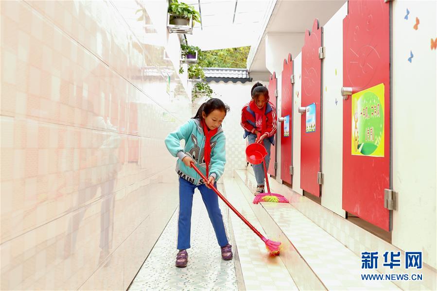 兩名學(xué)生在貴州省織金縣熊家場鎮(zhèn)小學(xué)的廁所打掃衛(wèi)生(2018年10月23日攝)。新華社 記者張玉薇/攝