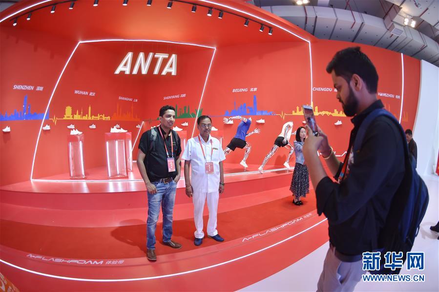在一年一度的中國(晉江)國際鞋業(yè)暨國際體育產(chǎn)業(yè)博覽會上,來自印度的客商在安踏展位前留影(2018年4月19日攝)。新華社 記者宋為偉/攝