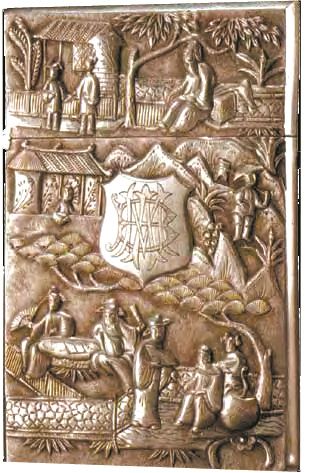據(jù)東莞鴉片戰(zhàn)爭博物館學者許鵬的說法,由于銀器在歐洲使用廣泛,所以銀質(zhì)名片盒最早開始出現(xiàn)。廣東省博物館在其廣東外銷品大展中也有這樣的說法:“銀是最早被采用制作名片盒的材質(zhì),名片盒底部隱蔽處常常刻有匠名、店號、成色等印記。”