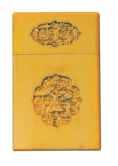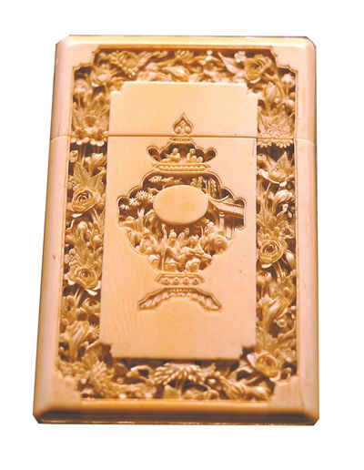 明清兩代廣州牙雕達到鼎盛時期。清代牙雕制品有小玩意兒、擺設品、實用品、祭祀品等大類, 鏤空編織、鑲嵌等全面發(fā)展和應用,形成了鮮明的嶺南地方風格。而廣東的工匠,更是將這種材質(zhì)用到了頂峰。乾隆五十八年,英國國王喬治三世特使馬戛爾尼一行參觀廣州牙雕后,在《旅行在中國》一書上寫道:“看來似乎最優(yōu)秀、最完美無瑕的頂峰,就是象牙雕刻?!笨梢娺@種工藝在西方人心目中留下的深刻印象。順理成章地,象牙材質(zhì)和工藝就被用在了名片盒上,而且成為高端產(chǎn)品。
