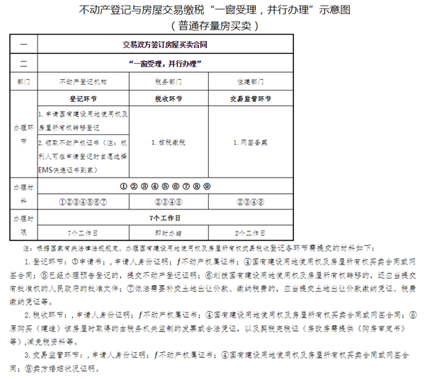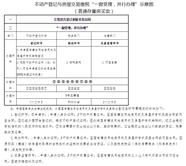 根據(jù)《通知》規(guī)定,各地不動(dòng)產(chǎn)登記機(jī)構(gòu)、住建部門、稅務(wù)部門必須進(jìn)駐同一個(gè)服務(wù)大廳,設(shè)置綜合受理窗口,將不動(dòng)產(chǎn)登記和房屋交易監(jiān)管、繳稅所需的法定材料編制形成統(tǒng)一的申請(qǐng)材料目錄向社會(huì)公布,實(shí)行“一次取號(hào)、一套資料、一窗受理”。