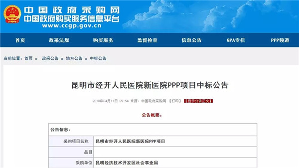 根據(jù)2018年4月7號(hào)昆明經(jīng)濟(jì)技術(shù)開發(fā)區(qū)社會(huì)事業(yè)局的《昆明市經(jīng)開人民醫(yī)院新醫(yī)院PPP項(xiàng)目中標(biāo)公告》可知,昆明市經(jīng)開人民醫(yī)院新院凈用地面積約70畝,總建筑面積129570平方米,設(shè)置床位數(shù)900床,其中醫(yī)療床位300床,康復(fù)養(yǎng)老床位600床,總投資10.85億元,建設(shè)周期為2年。