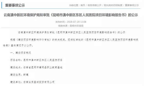 根據(jù)2018年7月20日,云南滇中新區(qū)環(huán)境保護(hù)局發(fā)布擬審批《昆明市滇中新區(qū)東區(qū)人民醫(yī)院項(xiàng)目環(huán)境影響報(bào)告書》的公示,計(jì)劃在嵩明縣職業(yè)教育基地內(nèi)新建一所醫(yī)院,共設(shè)置1000張床位。
