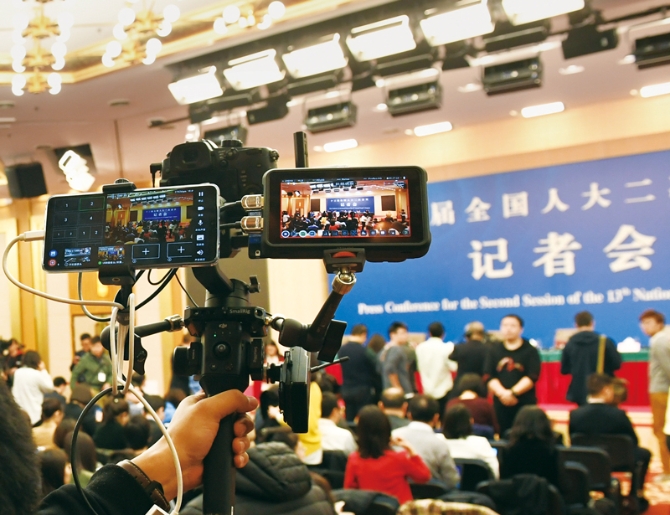 4K超高清、5G網(wǎng)絡(luò)傳輸、虛擬主持人、全景VR……2019年的全國(guó)兩會(huì),隨著媒體融合發(fā)展的成熟,越來(lái)越多的硬核黑科技應(yīng)用到現(xiàn)場(chǎng)。圖為記者在運(yùn)用4K+5G攝錄設(shè)備直播。 秦淮/視覺(jué)中國(guó)