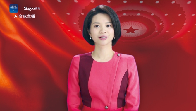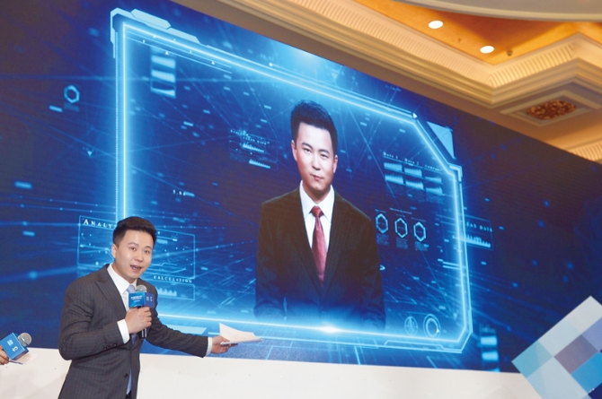 新華社聯(lián)合搜狗公司近日在京發(fā)布全新升級(jí)的站立式AI合成主播,并推出全球首個(gè)AI合成女主播,該女主播于2019年3月3日正式上崗,這是人工智能與新聞采編深度融合的最新突破性成果。上圖為正在播報(bào)新聞的新華社AI合成女主播(新華社供圖)。下圖為新華社AI主播和真身同臺(tái)(紅星新聞 王勤/視覺(jué)中國(guó))。