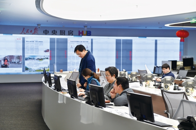人民日?qǐng)?bào)中央廚房是人民日?qǐng)?bào)社“策、采、編、發(fā)”的大腦和神經(jīng)中樞,也是報(bào)社推進(jìn)媒體融合發(fā)展的核心平臺(tái),其正式名稱是全媒體新聞平臺(tái)。上圖為人民日?qǐng)?bào)編輯們?cè)谥醒霃N房里認(rèn)真處理2019年兩會(huì)稿件(人民網(wǎng)記者 翁奇羽/攝)。下圖為人民日?qǐng)?bào)全媒體新聞大廳,它是中央廚房的物理呈現(xiàn)與主要載體(人民網(wǎng)記者 李根/攝)。