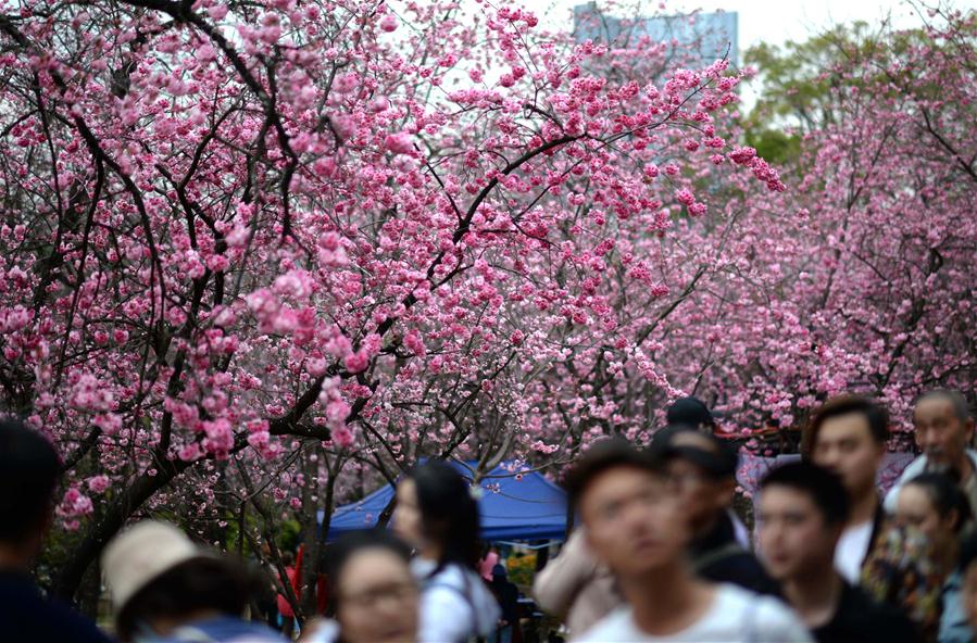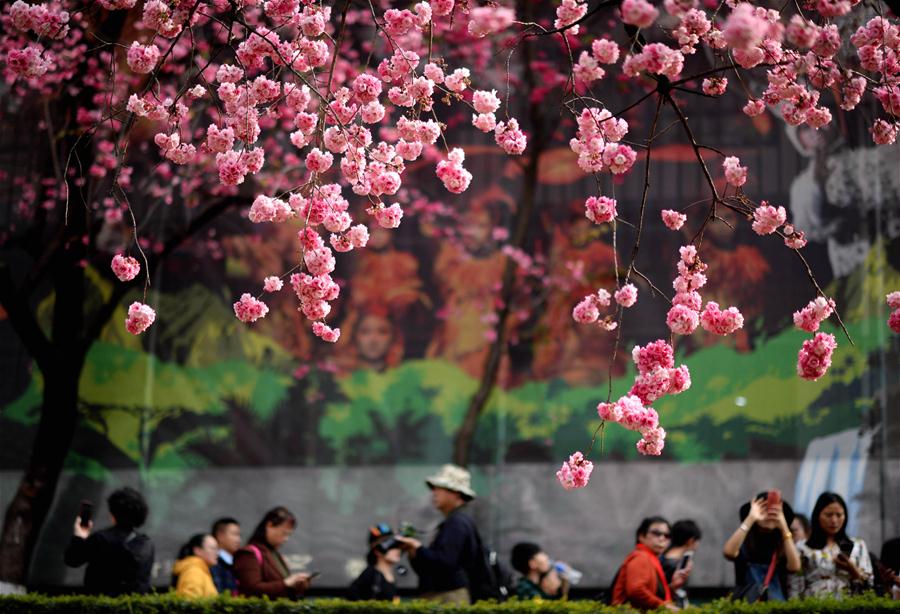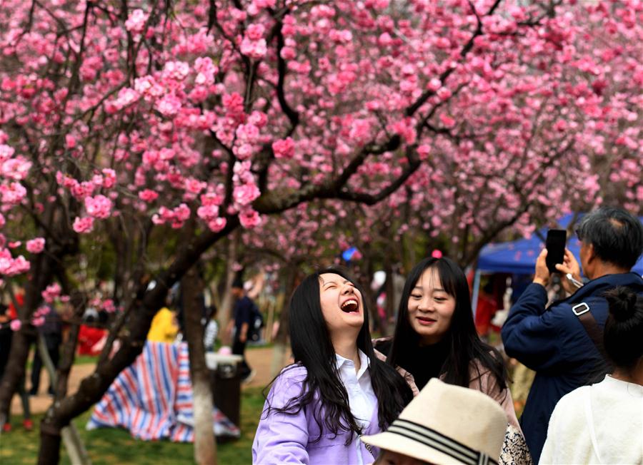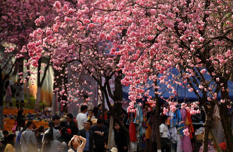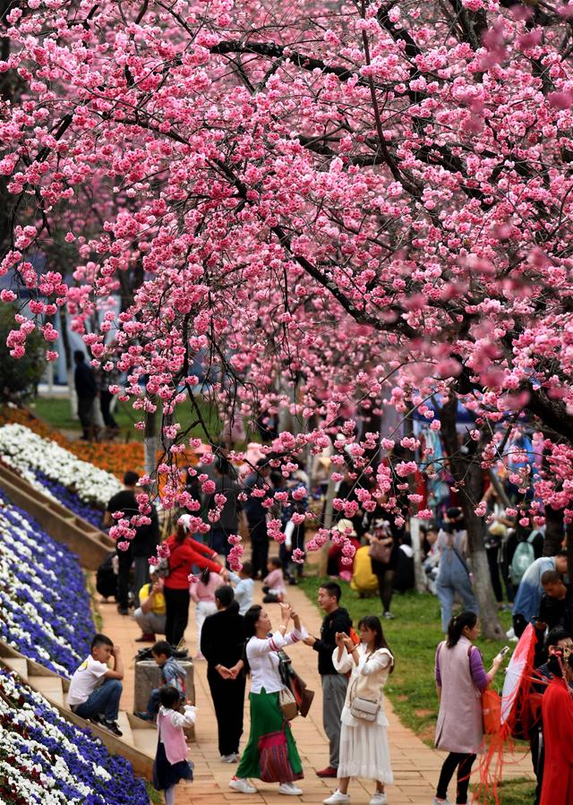 新華社照片,昆明,2019年3月17日 昆明櫻花盛開 游人紛至沓來 游人在昆明圓通山公園觀賞盛開的櫻花(3月16日攝)。近日,云南省昆明市迎來櫻花盛開的時節(jié)。昆明圓通山公園的數(shù)千株櫻花燦爛綻放,吸引了市民和游客前來觀花賞景。新華社記者 秦晴/攝