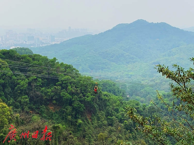但滑索滑行相當平穩(wěn),記者也逐漸適應(yīng),記者只需舉起雙手抓好頭頂?shù)姆鰲U,就能安心的欣賞腳下和遠處的風景。白云山蔥蔥綠樹、高低起伏的山巒美景,可謂盡收眼底。