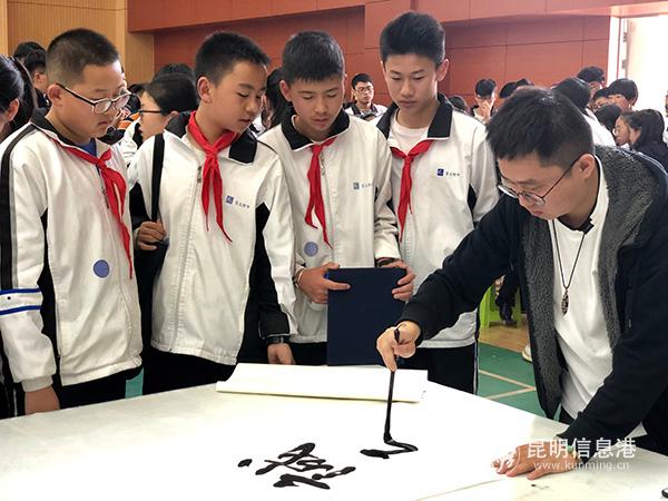 昆明信息港訊 記者上官艷君 為促進學校美育發(fā)展,加強學校文化建設,3月18日下午,民進昆明市委、昆明民進書畫院、民進昆明市委文化工作委員會、民進高新總支、善凡文化公司在云南大學附屬中學呈貢校區(qū)開展慶祝新中國成立70周年暨“名家進名校,美育進校園”公益活動,吸引該校200余師生參與。