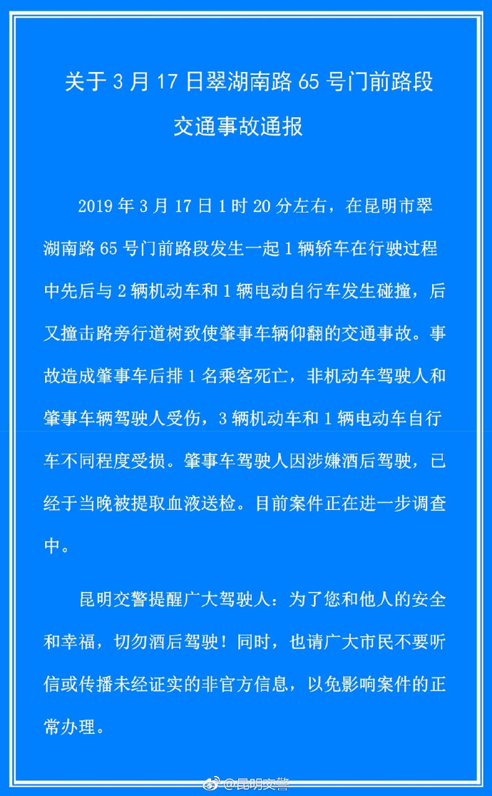 昆明交警提醒廣大駕駛?cè)?為了您和他人的安全和幸福,切勿酒后駕駛!同時(shí),也請(qǐng)廣大市民不要聽(tīng)信或傳播未經(jīng)證實(shí)的非官方信息,以免影響案件的正常辦理。