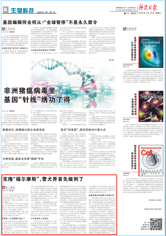 3月19日,科技日?qǐng)?bào)刊載題為《克隆“福爾摩斯”,警犬界首先做到了》的文章,講述中國(guó)第一頭克隆警犬誕生的歷程。