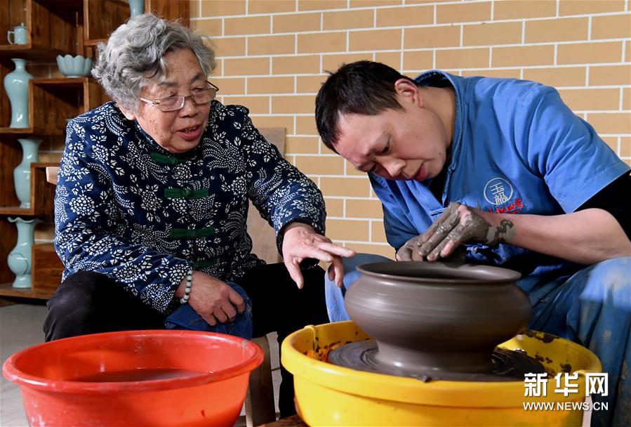 在位于河南省汝州市孟玉松的汝瓷生產(chǎn)車間內(nèi),孟玉松(左)指導(dǎo)工作人員拉坯(3月13日攝)。