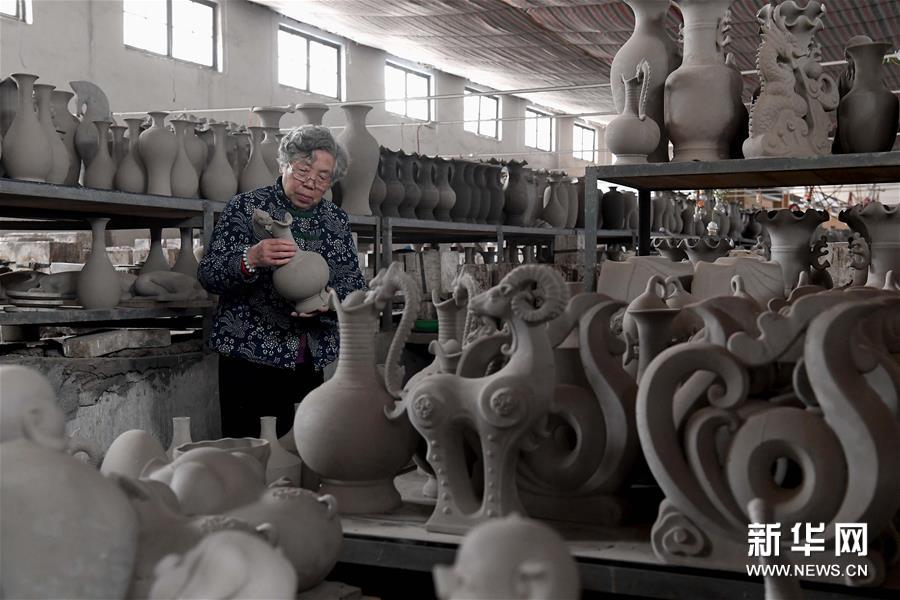 在位于河南省汝州市孟玉松的汝瓷生產(chǎn)車間內(nèi),孟玉松在擦坯(3月13日攝)。