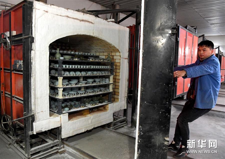 在位于河南省汝州市孟玉松的汝瓷生產(chǎn)車間內(nèi),一名工作人員在開窯(3月13日攝)。