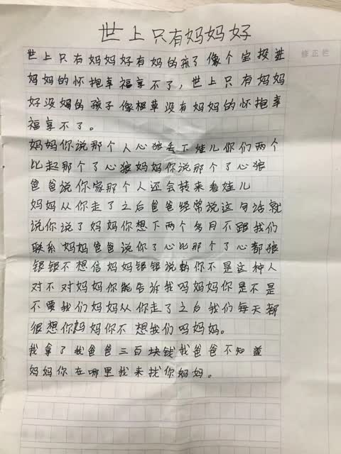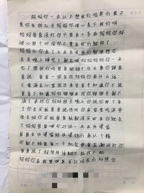 3個月前,母親與父親發(fā)生爭執(zhí)后,離家出走了。因為思念母親,他寫了千余字的日記,聲聲問著母親,“媽媽,你一點(diǎn)都不想我們么?你舍得丟下我們嗎?”