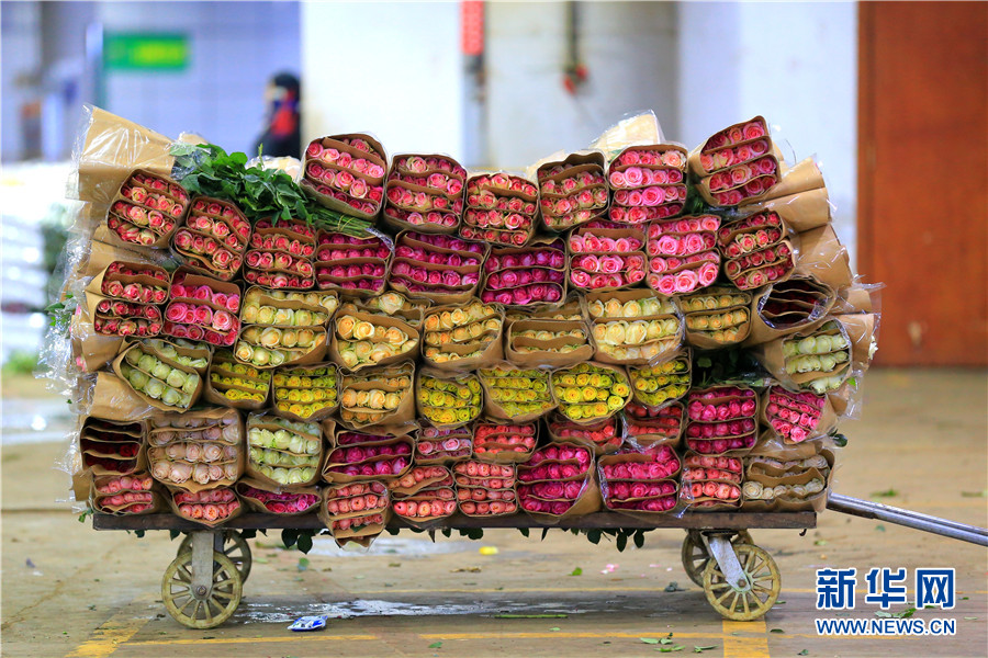 昆明斗南花卉市場,等待交易的一車玫瑰。(新華網(wǎng) 丁凝/攝)