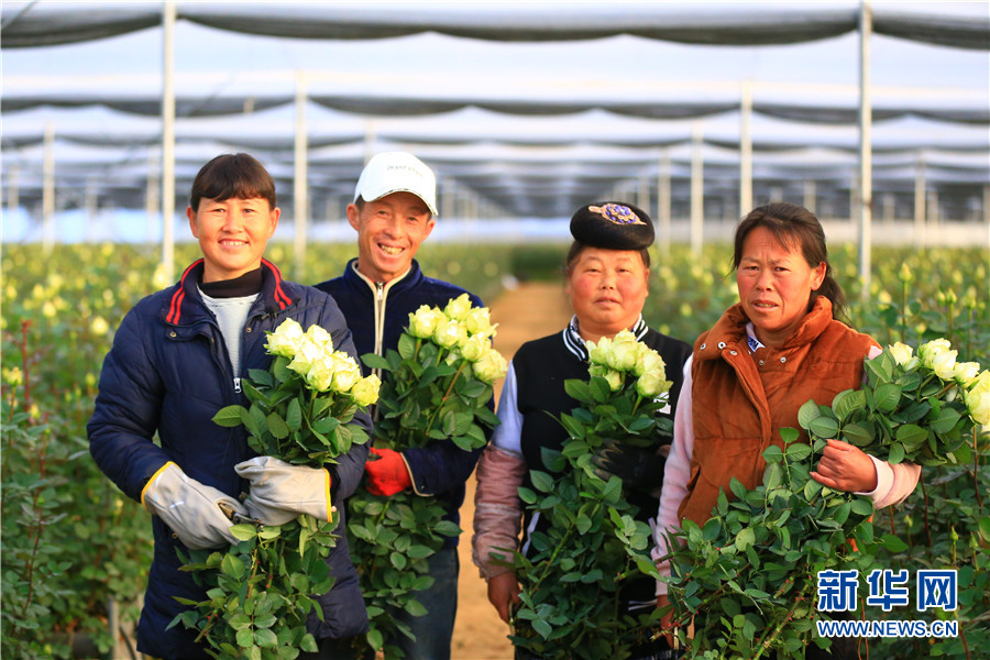 楊學(xué)彩(左1)和花農(nóng)們在種滿玫瑰的大棚里。(新華網(wǎng) 丁凝/攝)