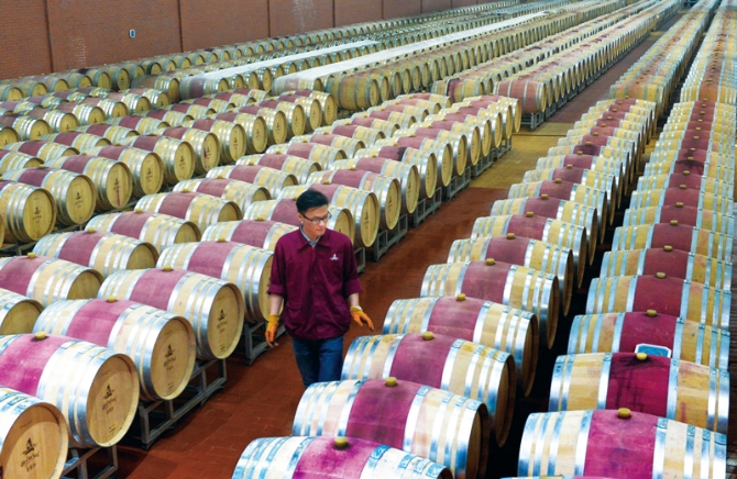 攜手共圓全面小康夢,閩寧對(duì)口扶貧協(xié)作結(jié)碩果。閩寧鎮(zhèn)以特色產(chǎn)業(yè)發(fā)展為支撐,培育了光伏、種植、葡萄酒等一批特色產(chǎn)業(yè),為當(dāng)?shù)厝罕姶蜷_致富門提供了“金鑰匙”。圖為寧夏永寧縣閩寧鎮(zhèn)賀蘭神酒莊的工人在檢查橡木桶。 詹安穩(wěn)/攝