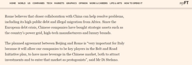 英國路透社3月18日也報道稱,意大利的港口是通往歐洲最富裕市場的便捷門戶,意大利政府希望通過參與“一帶一路”,能促進(jìn)本國出口與投資,幫助疲弱的經(jīng)濟擺脫10年來的第三次衰退。