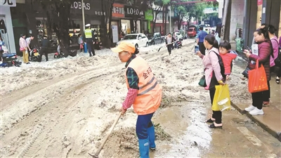環(huán)衛(wèi)工人正在清理街道上的冰雹。唐蘭/攝