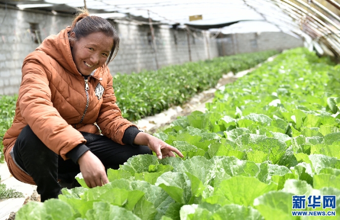 2018年3月27日,克松村種菜能手白瑪央宗在自己承包的溫室里勞作。新華社記者覺果攝