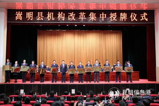 昆明信息港訊 3月20日,縣委、縣政府舉行機(jī)構(gòu)改革集中授牌儀式??h領(lǐng)導(dǎo)楊相來(lái)、潘加智、姚富正、李俊彪等出席儀式,全縣科級(jí)以上領(lǐng)導(dǎo)干部參加授牌儀式。