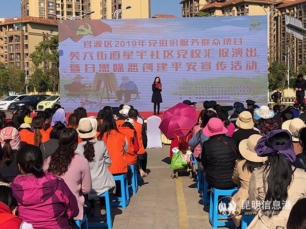 昆明信息港訊 記者龍泉積 3月21日,官渡區(qū)矣六街道星宇社區(qū)黨組織服務(wù)群眾項(xiàng)目星宇社區(qū)黨校匯報(bào)演出暨掃黑除惡創(chuàng)建平安宣傳活動(dòng)在星云園廣場舉行。現(xiàn)場,社區(qū)黨校的學(xué)員們通過匯報(bào)表演的形式,向大家展示他們的學(xué)習(xí)成果。同時(shí),通過開展掃黑除惡專項(xiàng)斗爭宣傳進(jìn)社區(qū)活動(dòng),進(jìn)一步提高廣大群眾的安全防范意識(shí)和法律意識(shí),宣傳黨和政府打擊黑惡勢力的堅(jiān)定決心,壯大“掃黑除惡”專項(xiàng)斗爭聲勢,營造平安和諧、全民參與的濃厚社會(huì)氛圍。