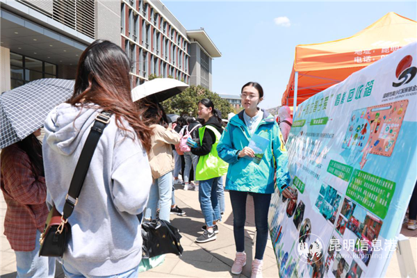 整個活動過程中,志愿者向過往師生發(fā)放了制作精美、圖文并茂的《昆明市城市生活垃圾分類指導手冊》和生活垃圾分類宣傳海報,指導師生學習垃圾分類知識。垃圾分類宣傳展板前,學生駐足觀看學習,一旁的志愿者從生活垃圾如何分類、生活垃圾的分類意義等方面進行了簡單講解。