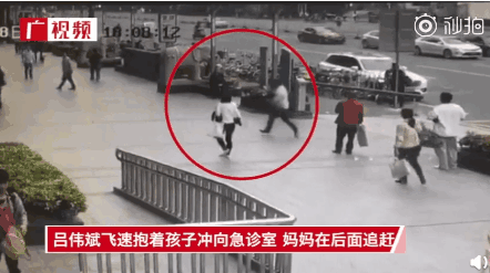 車輛停穩(wěn)后,呂偉斌顧不上關車門和取車匙,迅速下車抱起孩子,直奔急診室。孩子母親一路在后面小跑跟著。