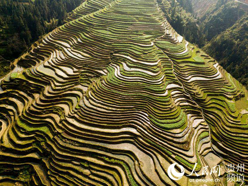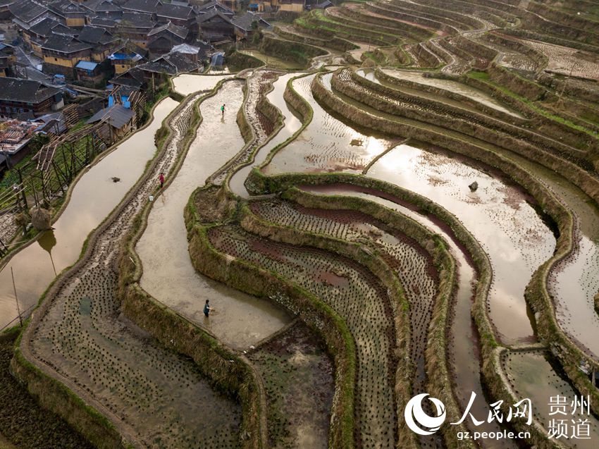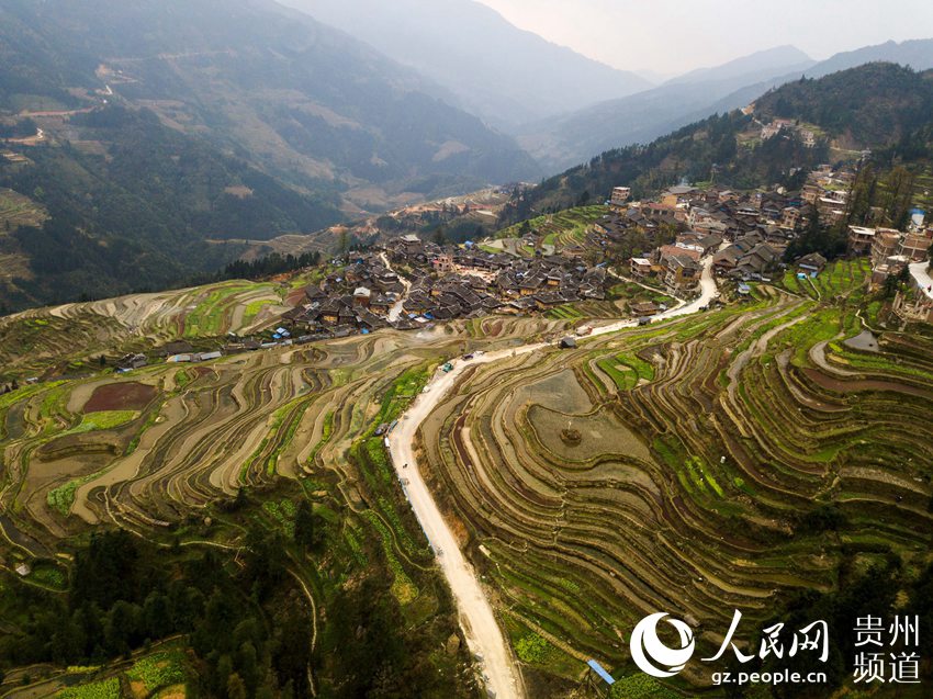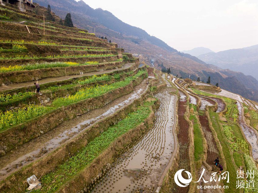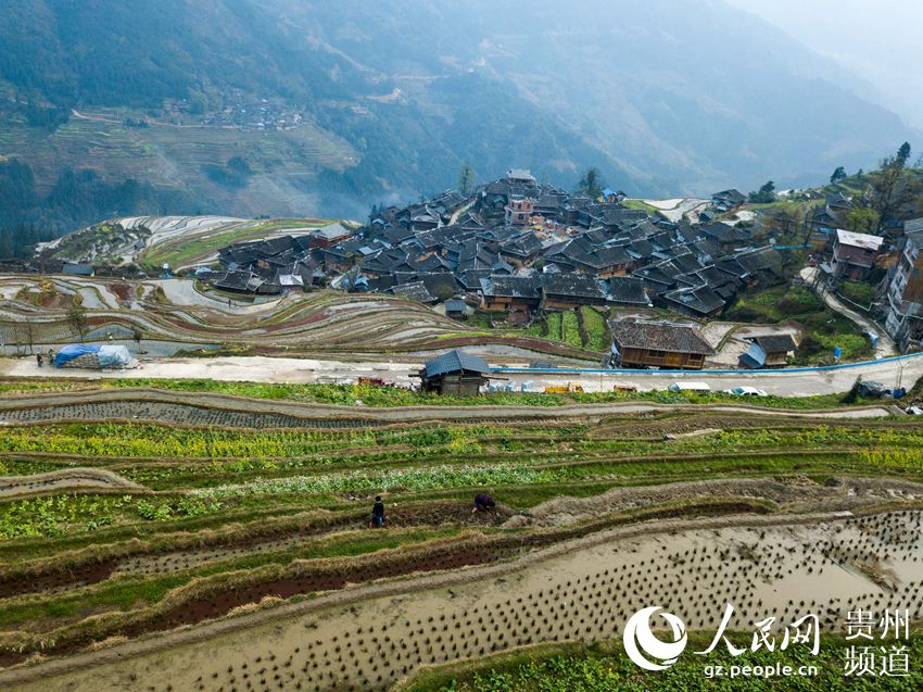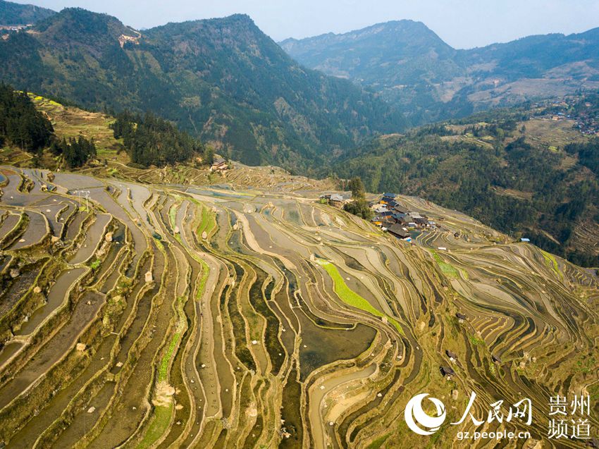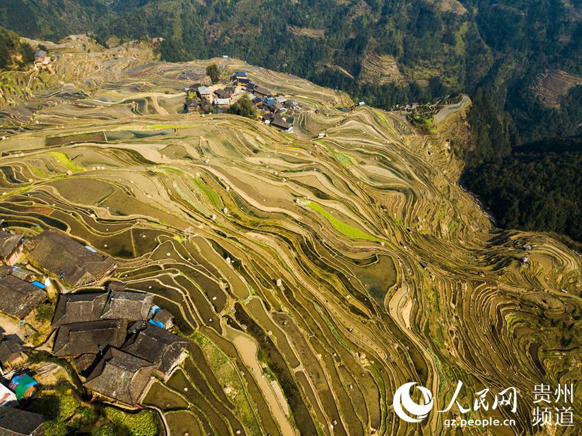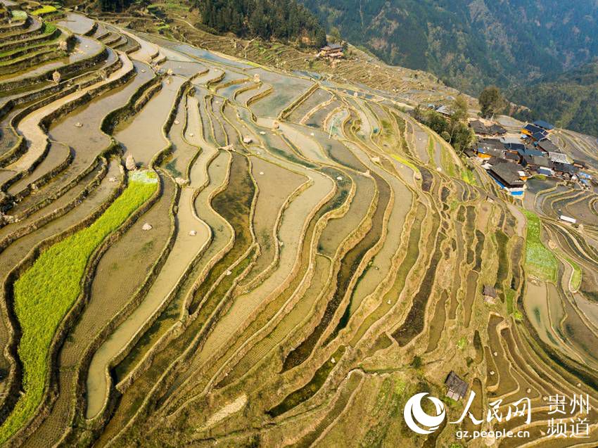 3月22日,地處貴州省黔東南苗族侗族自治州從江縣西部月亮山腹地的加榜梯田春意盎然,層層疊疊的梯田與青山、苗家吊腳樓及勞作的村民構(gòu)成了一幅美麗的鄉(xiāng)村春日景象。(吳德軍)