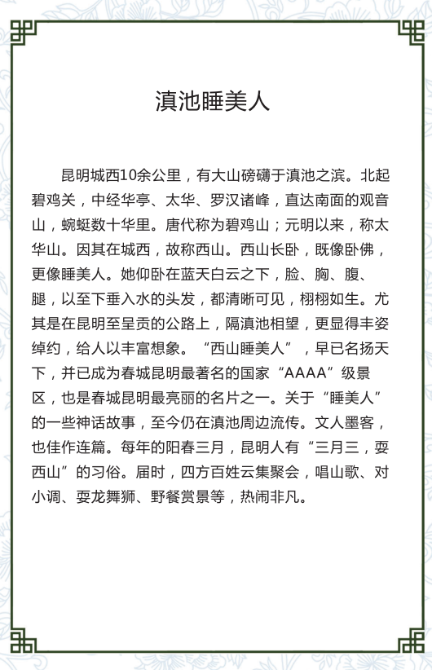 從昆明眺望,西山如一位美女屈腿坦臥在藍天下,她的臉、胸、腹、腿、以至下垂入水的頭發(fā)都歷歷在目。隔水相望,更顯嫵媚?!拔魃剿廊恕痹缫衙麚P天下。滇池岸邊,至今還流傳著關于她的許多動人傳說。