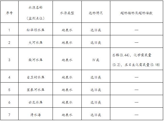 監(jiān)測(cè)結(jié)果顯示,除柴河水庫(kù)為Ⅳ類水外,其余6個(gè)集中式生活飲用水水源達(dá)到或優(yōu)于Ⅲ類水標(biāo)準(zhǔn),達(dá)標(biāo)率為85.7%。