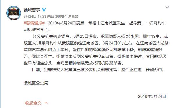 據(jù)鼎城警方通報(bào),經(jīng)公安機(jī)關(guān)初步調(diào)查,3月23日深夜,犯罪嫌疑人楊某淇(男,現(xiàn)年19歲,武陵區(qū)人)搭乘網(wǎng)約車從武陵區(qū)前往江南城區(qū)。3月24日0時(shí)左右,在江南城區(qū)大湖路常南汽車總站附近下車時(shí),坐在后排的楊某淇乘司機(jī)陳某不備,朝陳某連捅數(shù)刀,致陳某死亡。楊某淇事后到公安機(jī)關(guān)投案自首,據(jù)楊某淇供述,其因悲觀厭世早有輕生念頭,當(dāng)晚因精神崩潰無故將司機(jī)陳某殺害。