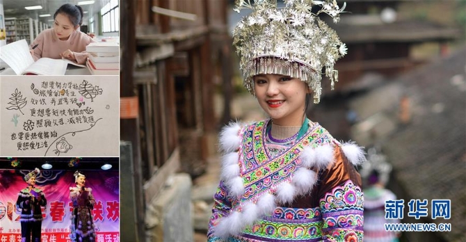 一張拼版照片:右圖為楊琳詩瑤(2月16日新華社記者黃孝邦攝);左上圖為楊琳詩瑤在學(xué)校圖書館里學(xué)習(xí)(3月23日攝,楊琳詩瑤供圖);左中圖為楊琳詩瑤在紙上寫下的夢想(3月23日攝,楊琳詩瑤供圖);左下圖為楊琳詩瑤(右)在家鄉(xiāng)主持苗寨的春節(jié)聯(lián)歡晚會(huì)(2月10日新華社記者黃孝邦攝)。楊琳詩瑤是融水苗族自治縣桿洞鄉(xiāng)桿洞村的苗族姑娘,去年以優(yōu)異成績考上廣西民族大學(xué)。新華社發(fā)