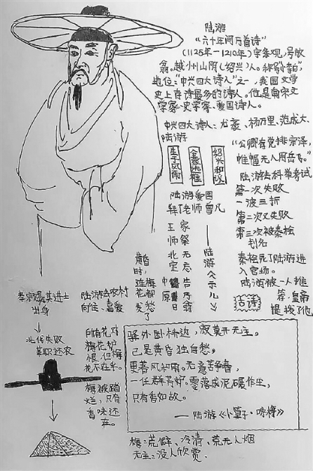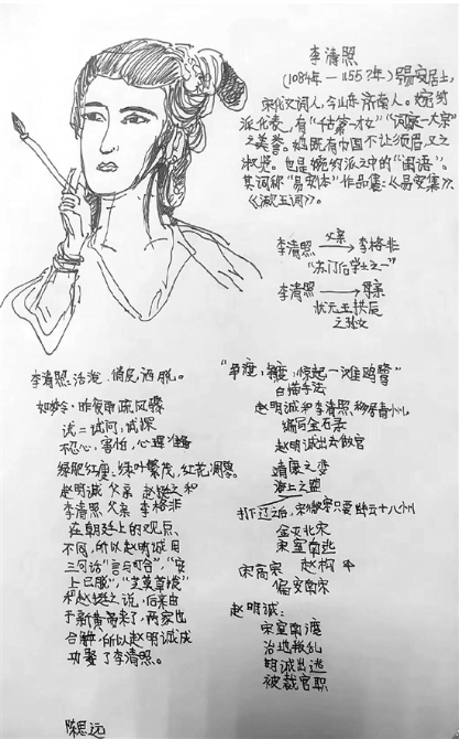 ?小陳同學(xué)坦白,這些筆記是他上課和平時(shí)看書時(shí)做的,所以準(zhǔn)確地說,是讀書筆記。筆記上都是語文書和課外書里講過的名人,一個(gè)人物一頁,除了文字見解,還配上了人物的頭像和小插畫。