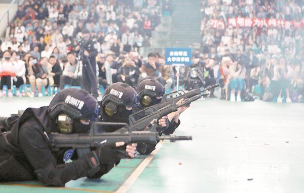 ?現(xiàn)場,特警隊(duì)員展示了戰(zhàn)術(shù)動(dòng)作和搏擊動(dòng)作。在教授學(xué)生安全防范技能的環(huán)節(jié),師生們興趣十足,不論男女,都爭先恐后上臺(tái)與警員精彩互動(dòng)。