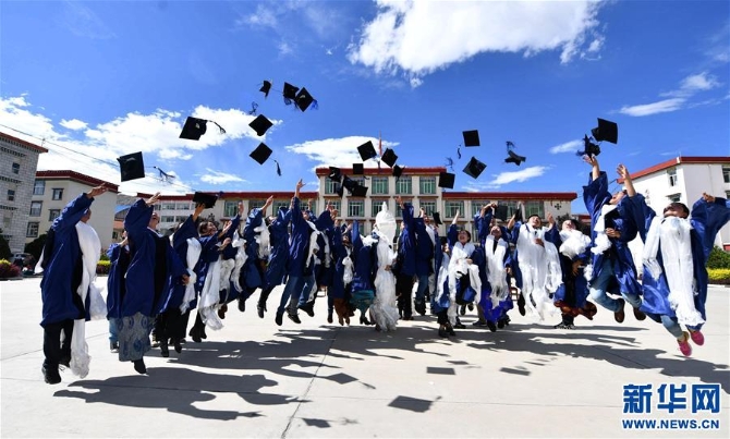 西藏藏醫(yī)學(xué)院碩士畢業(yè)生歡慶順利畢業(yè)(2018年6月14日攝)。新華社記者 晉美多吉攝