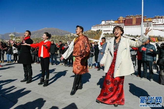 2018年12月31日,演員在布達(dá)拉宮廣場(chǎng)的快閃活動(dòng)中演唱《我和我的祖國(guó)》。 新華社記者 劉東君攝